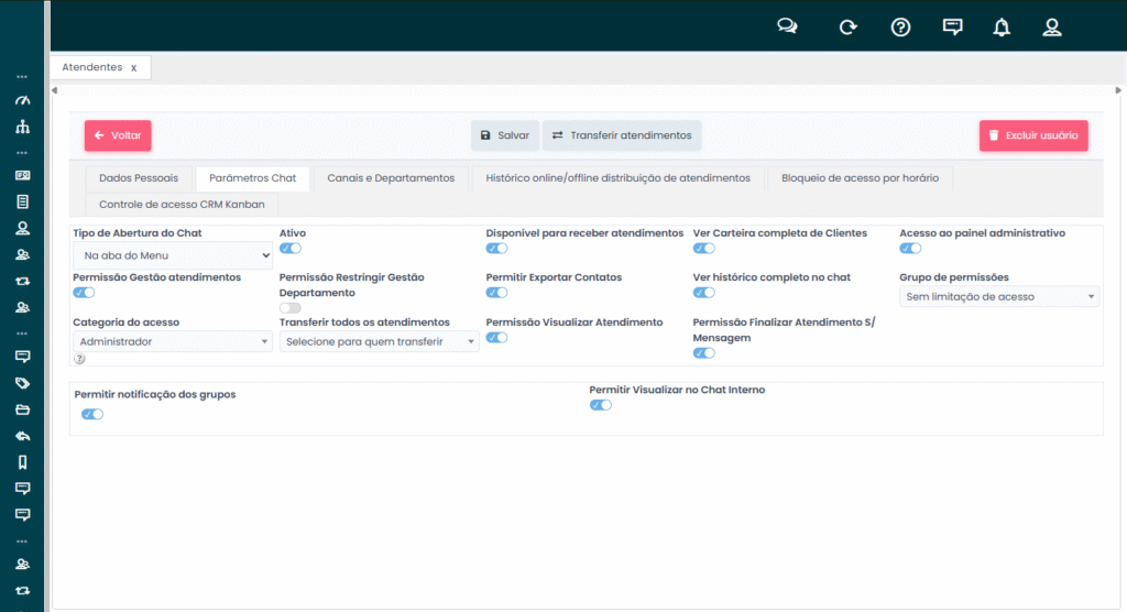 Quando essa permissão está habilitada, o atendente pode visualizar e gerenciar módulos como chat, contatos, históricos, grupos e outros.